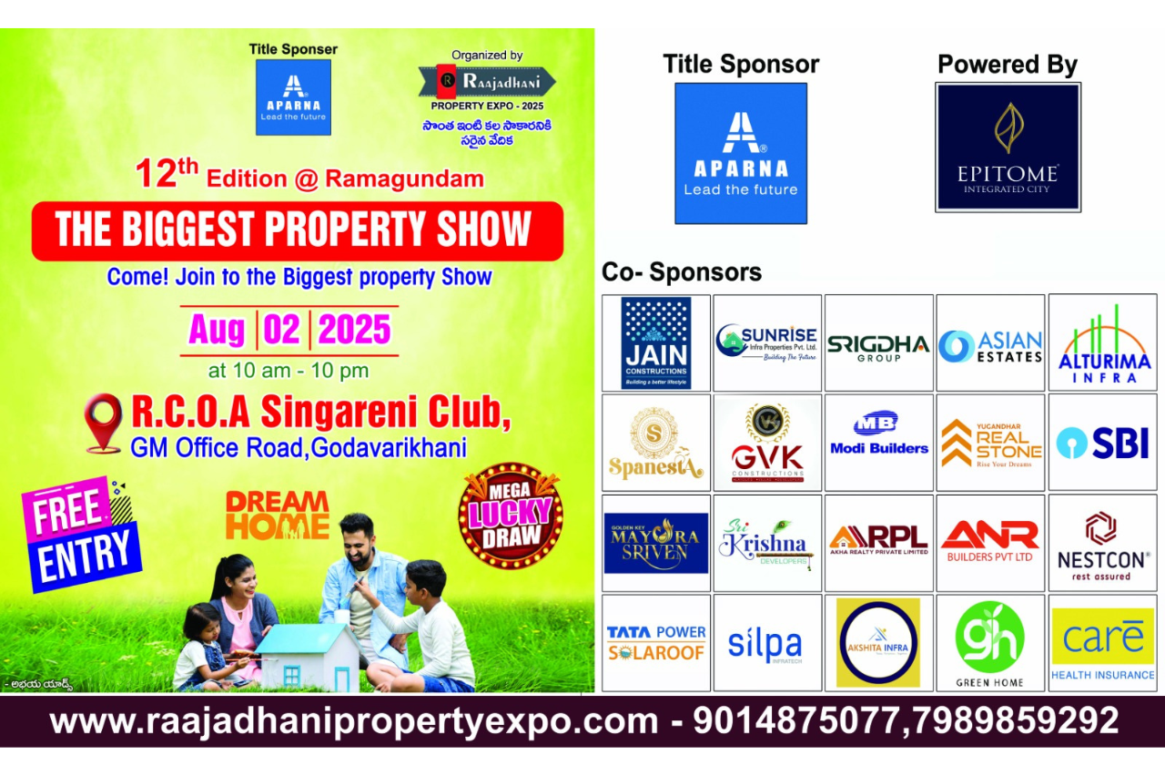Raajadhani Expo is a premier real estate exhibition connecting buyers with top builders, developers, and financial institutions. Showcasing plots, apartments, villas, and interior solutions, it provides seamless property investment opportunities. With successful editions across major cities like Siddipet, Hanumakonda, Karimnagar, and more, it attracts leading sponsors and banking partners. Offering free entry, exciting lucky draws, and extensive media coverage, Raajadhani Expo is a trusted platform for property seekers to explore, compare, and invest in their dream homes effortlessly.